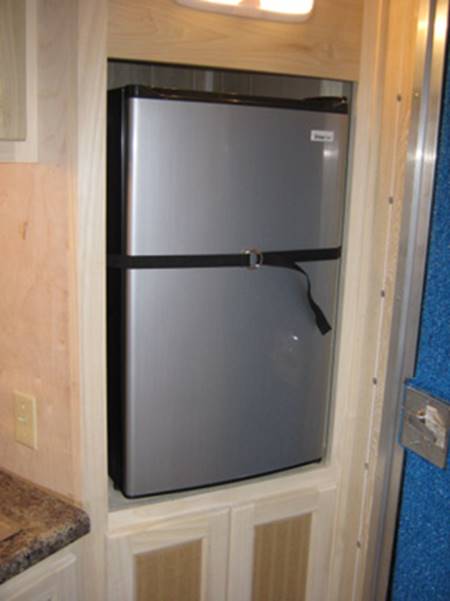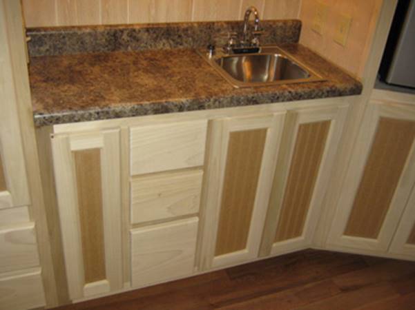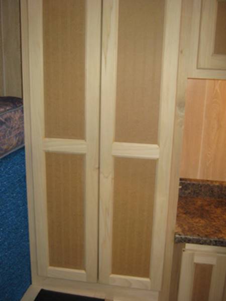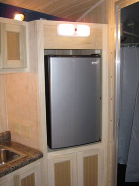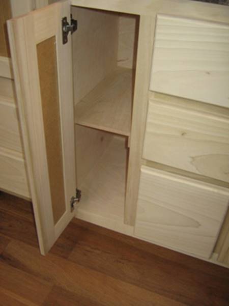 Frig. Cabinet sets at an angle from base cabinet. All cabinets are made of